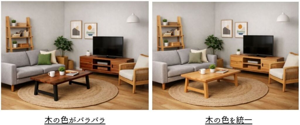 それぞれの家具の木の色味が異なる場合と、統一した場合の違いを見てみます。