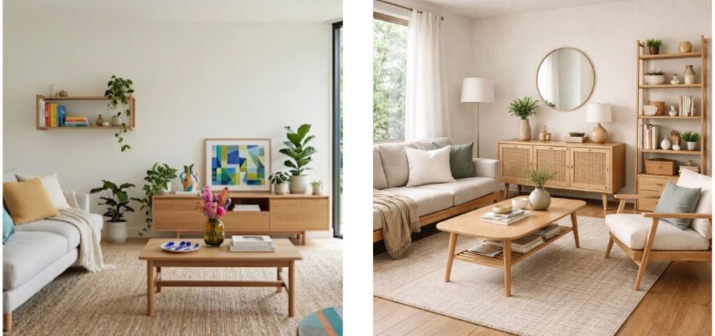 同じ家具を置いているのに木の色を揃えた右の方が、統一感がありすっきりとまとまった印象になります。