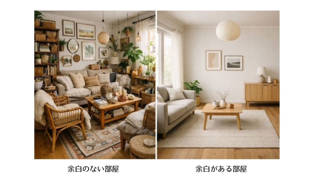 大きすぎる家具や、家具の置きすぎは部屋の余白を埋めてしまいます。